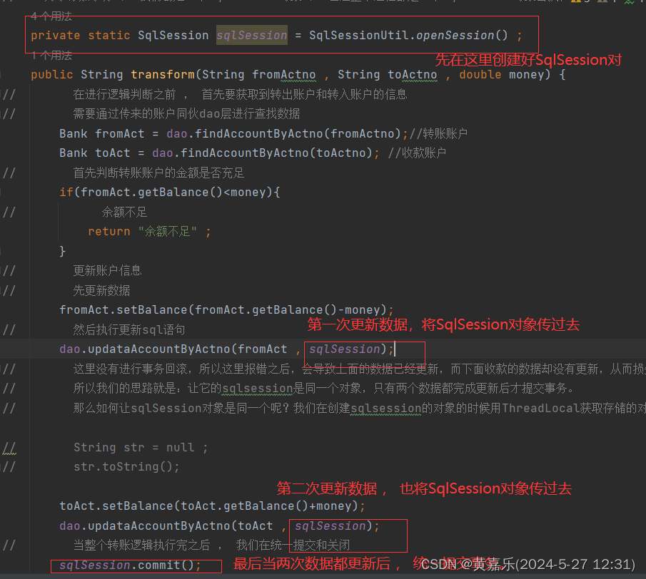 // 所以我们的思路就是:让它的sqlsession是同一个对象,只有两个数据都完成更新后才提交事务。