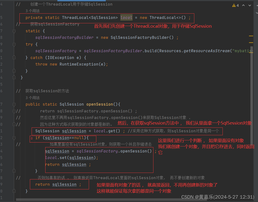 现在我们需要使用ThreadLocal去存储一个sqlSession对象,我们在service层创建好一个sqlSession对象 , 然后把它存到ThreadLocal中去,然后在dao层中我们还是继续创建一个sqlSession对象 , 但是创建方法我们需要改,并不是直接调用SqlSession.opensession()方法去创建 , 因为这样一定是一个新的sqlSession对象 , 我们从ThreadLocal中获取 , 因为刚刚在service层我们已经创建了一个sqlSession对象并且存进去了,所以我们就是直接取这个sqlSession对象 , 这样就导致我们dao层每次获得的sqlSession对象都是同一个。