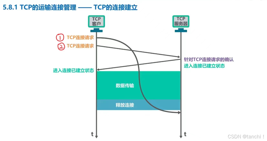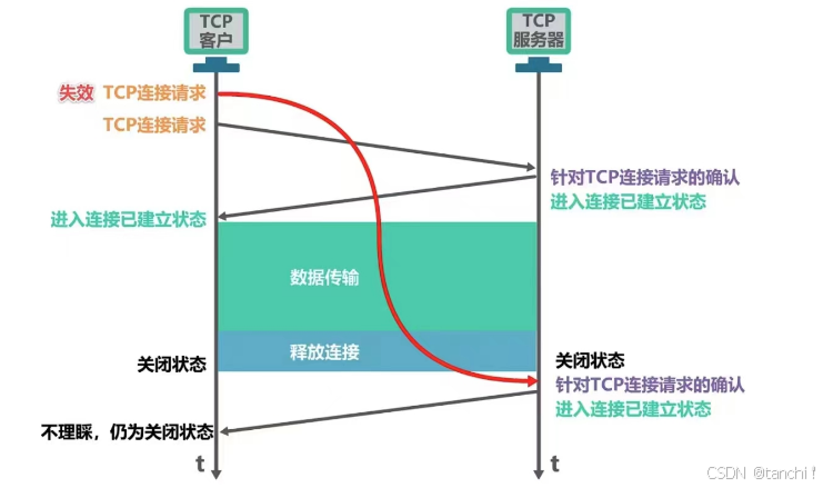 如图,当客户端向服务端请求服务,那么会首先发送第一条TCP连接请求(图中的序号1表明的请求),但是此时由于网络拥塞,导致序号1这条请求没有在超时时间内接收到TCP服务器的响应SYN-ACK报文,那么会超时重传这一条请求报文,此时发送第二条TCP连接请求(图中序号2表明的请求),网络好转,TCP服务器接受到了这条报文,于是发送SYN-ACK报文给客户端,并且开启连接状态(因为是二次握手所以此时已经开启了连接状态)。客户端收到了服务端的SYN-ACK报文后,也开始传输数据了。然后也是传输数据,到最后的释放连接。此时本次连接也完全结束了。就在大家以为万事平安的时候,客户端发送的第一条TCP连接请求,此时偷家啦!!!他其实一直没有离开,只是晚到了而已!正义也许会迟到,但是绝对不会忘记砸到你的头顶!(bushi...)那么此时服务端接受到了这条消息,他就以为客户端又想请求第二次的服务了,所以服务端会发送SYN-ACK报文给客户端,并且开启连接的状态,等待客户端发送数据,但是此时客户端其实是处于了关机的状态了,根本不会理会你,所以,就会白白浪费了服务端的资源,而且服务端也不敢释放连接,认为客户端在忙其他事情还没回应我,等了很久发送探测报文才知道服务端挂了。(好不容易心动一次,你让我输的这么彻底!)
