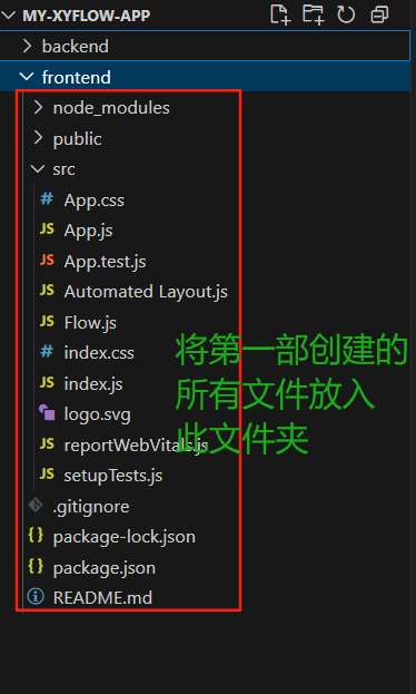 2.新建一个frontend文件夹,将创建的前端文件全部放进frontend文件夹,然后在项目目录下创建一个banckend文件夹,用来存放后端代码。