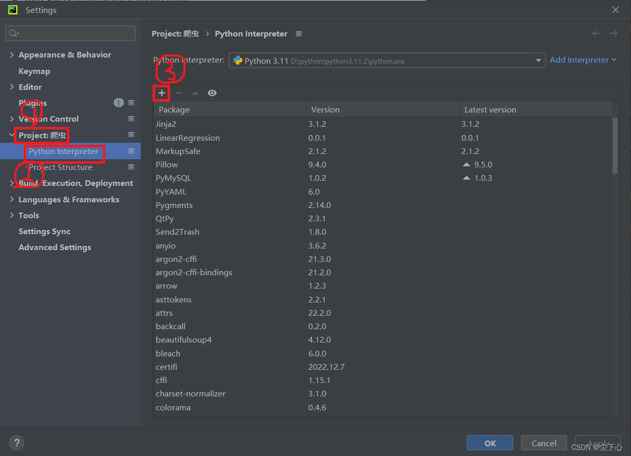 file-->settings-->python Interpreter-->+ 进入搜索界面