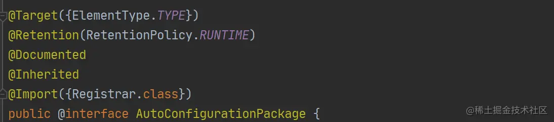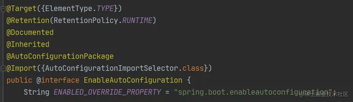 我们再次点击@EnableAutoConfiguration进入查看,它是一个由 @AutoConfigurationPackage 和 @Import 注解组成的复合注解;