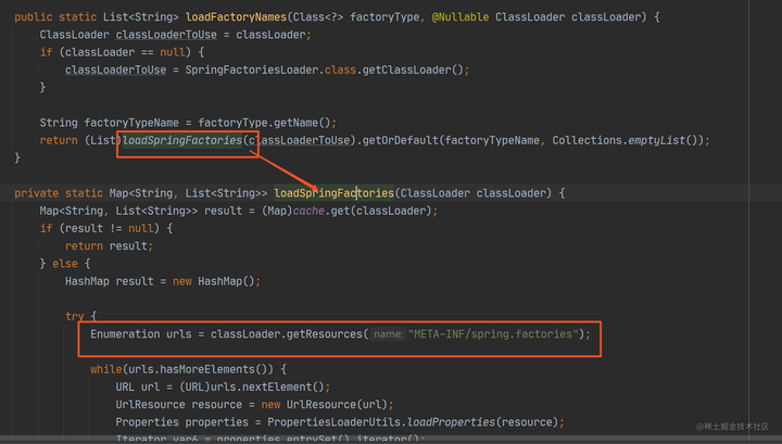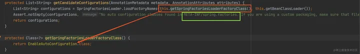 我们继续往getCandidateConfigurations 方法里看,最终通过SpringFactoriesLoader.loadFactoryNames来获取最终的configurations,并且可以通过断言发现会使用到META-INF/spring.factories文件,那么我们再进入SpringFactoriesLoader.loadFactoryNames()中来看下最终的实现。