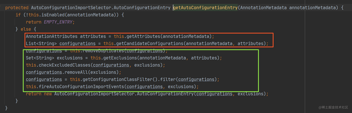 进入到getAutoConfigurationEntry 方法中可以看到主要是getCandidateConfigurations 来获取候选的 Bean,并将其存为一个集合;后续的方法都是在去重,校验等一系列的操作。