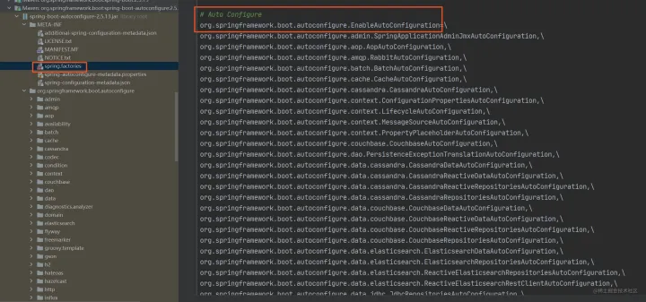 SpringFactoriesLoader.loadFactoryNames()方法会读取META-INF/spring.factories文件下的内容到Map中,再结合传入的factoryType=EnableAutoConfiguration.class,因此会拿到 org.springframework.boot.autoconfigure.EnableAutoConfiguration为key对应的各个XXAutoConfiguration的值,然后springboot在结合各个starter中的代码完成对于XXAutoConfiguration中的Bean的加载动作。