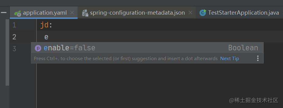 spring-boot-configuration-processor:将自定义的配置类生成配置元数据,所以在引用自定义STARTER的工程的YML文件中,给自定义配置初始化时,会有属性名的提示;确保在使用@ConfigurationProperties注解时,可以优雅的读取配置信息,引入该依赖后,IDEA不会出现“spring boot configuration annotation processor not configured”的错误;编译之后会在META-INF 下生成一个spring-configuration-metadata.json 文件,大概内容就是定义的配置的元数据;效果如下截图。