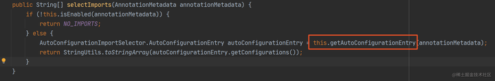 所以,我们可以知道@Import 注解其实就是为了去导入一个类。所以这里@Import({AutoConfigurationImportSelector.class}) 就是为了导入AutoConfigurationImportSelector 类,那我们继续来看这个类,AutoConfigurationImportSelector实现的是DeferredImportSelector接口,这是一个延迟导入的类;再细看会有一个方法比较显眼,根据注解元数据来选择导入组件,当注解元数据空,直接返回一个空数组;否则就调用getAutoConfigurationEntry ,方法中会使用AutoConfigurationEntry的getConfigurations(),configurations是一个List<String>,那么我们看下AutoConfigurationEntry是怎么生成的。
