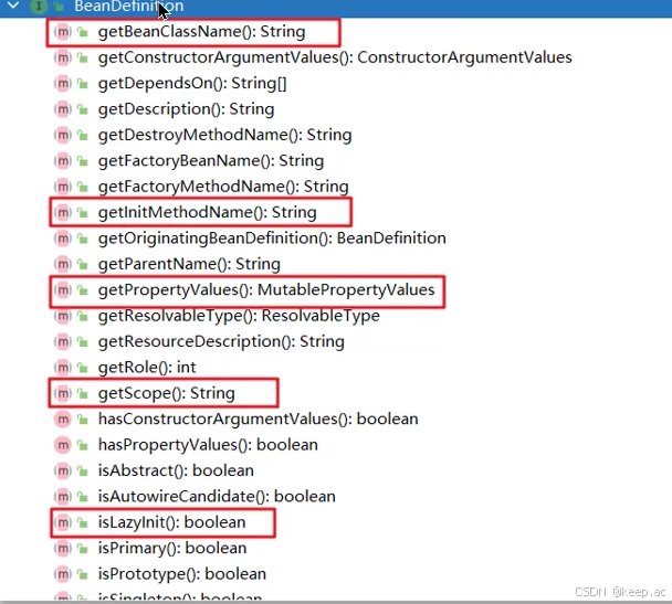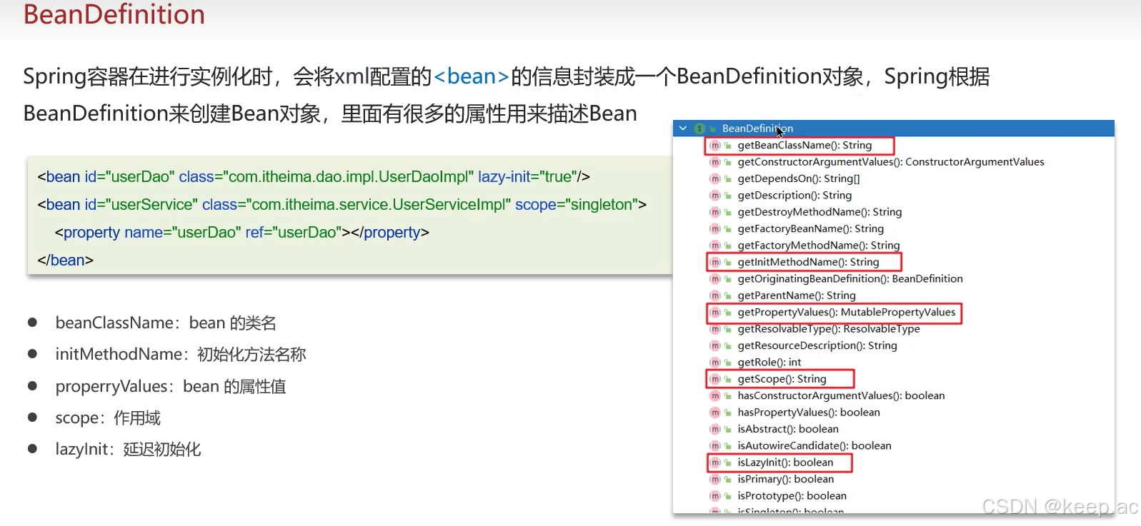 Spring容器在进行实例化时,会将xml配置的的信息(注解也是同理)封装成一个BeanDefinition对象,Spring根据BeanDefinition来创建Bean对象,里面有很多的属性用来描述Bean。