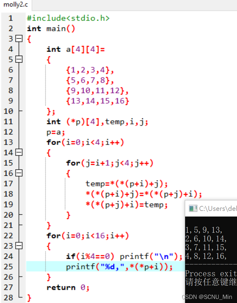 如果用行指针,最后输出时可以用*(*p+i) //相当于*(*(p+0)+i)