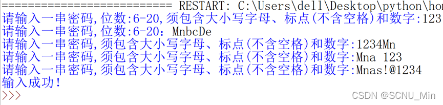 password = input('请输入一串密码,位数:6-20,须包含大小写字母、标点(不含空格)和数字:')
