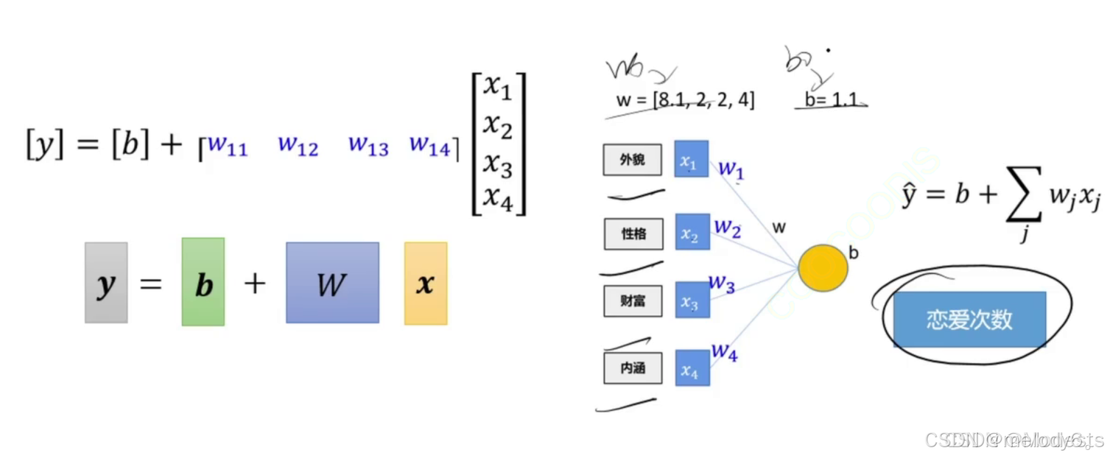 y 是通过线性公式 y = x * w + b 计算得到的。