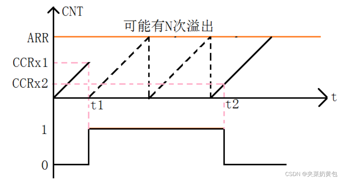 在 t1~t2 之间,可能产生 N 次定时器溢出,这就要求我们对定时器溢出,做处理,防止高电平太长,导致数据不准确。如图所示,t1~t2之间,CNT计数的次数等于:N*ARR+CCRx2, 有了这个计数次数,再乘以 CNT 的计数周期,即可得到 t2-t1 的时间长度,即高电平持续时间。