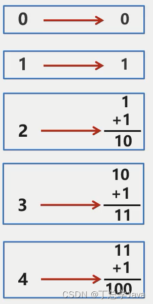 - 只有0、1,按照 逢2进1 的方式表示数据: