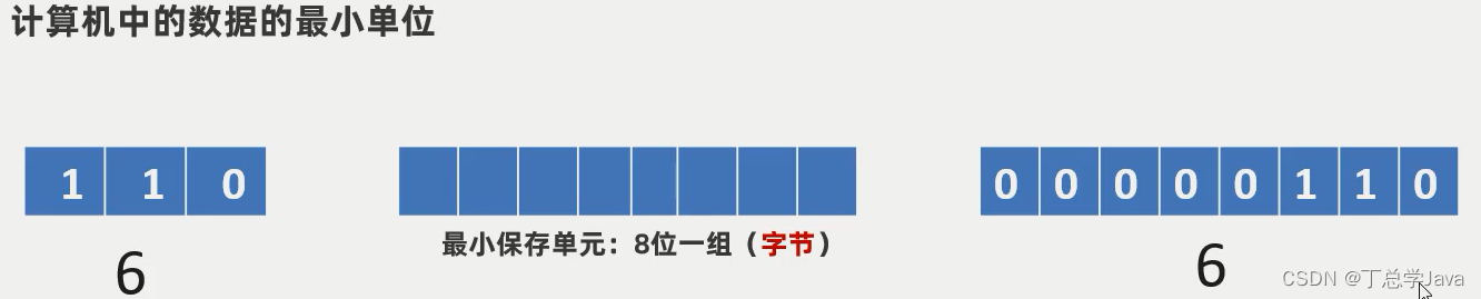 - 计算机最小的组成单元是:使用8个二进制位为一组,来保存数据,我们称之为一个字节(byte,简称B)。