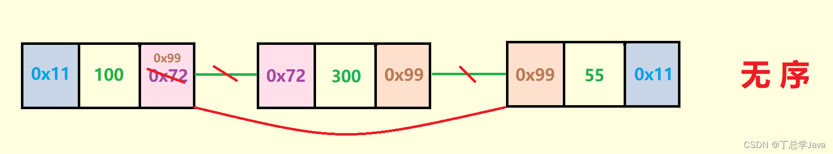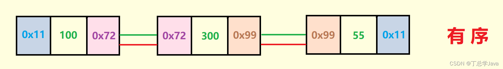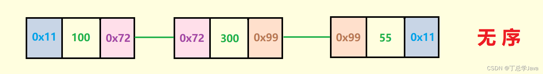 - 链表中只要一条链子,不能保证元素的顺序(存储元素和取出元素的顺序有可能不一致)