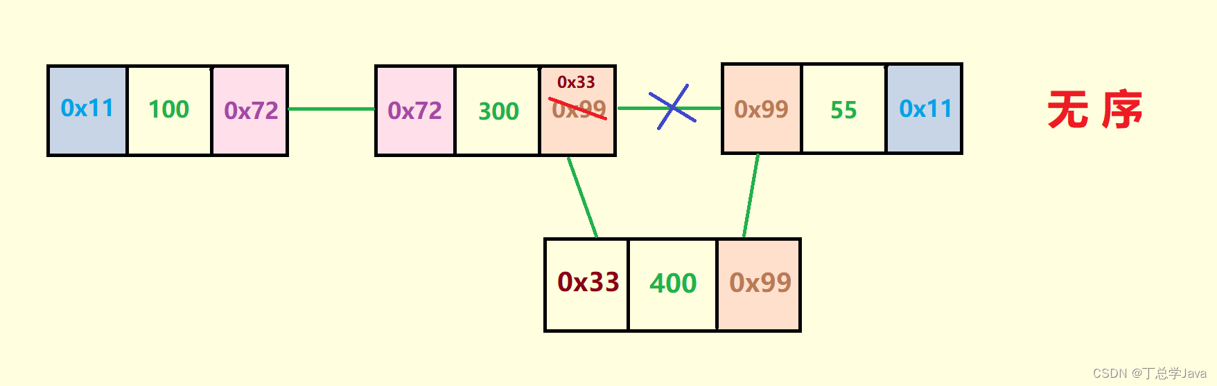 - 链表中有两条链子,有一条链子是专门记录元素的顺序,是一个有序的集合