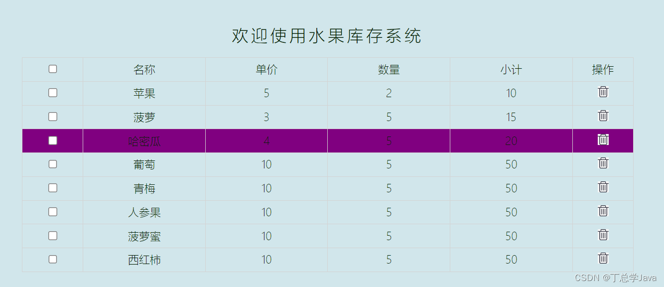 <!DOCTYPE html> <html lang="zh_CN"> <head> <meta charset="UTF-8"> <meta http-equiv="X-UA-Compatible" content="IE=edge"> <meta name="viewport" content="width=device-width, initial-scale=1.0"> <title>js-DOM/BOM实战</title> <link href="style/fruit.css" rel="stylesheet"></link> <script src="js/鼠标悬浮和离开事件.js"></script> </head> <body> <div id="div0"> <div id="div_title">欢迎使用水果库存系统</div> <div id="div2"> <table id="fruit_tbl"> <tr> <th class="w10"><input type="checkbox" /></th> <th class="w20">名称</th> <th class="w20">单价</th> <th class="w20">数量</th> <th class="w20">小计</th> <th class="w10">操作</th> </tr> <!-- on:当...时候 mouse:鼠标 over:在...上--> <!--当鼠标悬浮在这个tr上时,调用showBGColor()这个方法--> <tr> <td><input type="checkbox" /></td> <td>苹果</td> <td>5</td> <td>2</td> <td>10</td> <td><img src='imgs/del.png' class="delBtn"/></td> </tr> <tr> <td><input type="checkbox" /></td> <td>菠萝</td> <td>3</td> <td>5</td> <td>15</td> <td><img src='imgs/del.png' class="delBtn"/></td> </tr> <tr> <td><input type="checkbox" /></td> <td>哈密瓜</td> <td>4</td> <td>5</td> <td>20</td> <td><img src='imgs/del.png' class="delBtn"/></td> </tr> <tr> <td><input type="checkbox" /></td> <td>葡萄</td> <td>10</td> <td>5</td> <td>50</td> <td><img src='imgs/del.png' class="delBtn"/></td> </tr> <tr> <td><input type="checkbox" /></td> <td>青梅</td> <td>10</td> <td>5</td> <td>50</td> <td><img src='imgs/del.png' class="delBtn"/></td> </tr> <tr> <td><input type="checkbox" /></td> <td>人参果</td> <td>10</td> <td>5</td> <td>50</td> <td><img src='imgs/del.png' class="delBtn"/></td> </tr> <tr> <td><input type="checkbox" /></td> <td>菠萝蜜</td></td> <td>10</td> <td>5</td> <td>50</td> <td><img src='imgs/del.png' class="delBtn"/></td> </tr> <tr> <td><input type="checkbox" /></td> <td>西红柿</td> <td>10</td> <td>5</td> <td>50</td> <td><img src='imgs/del.png' class="delBtn"/></td> </tr> </table> </div> </div> </body> </html>3、fruit.css
