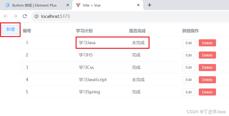 <template> <el-container> <el-row> <el-button type="primary" plain>新增</el-button> </el-row> <el-table :data="scheduleList" style="width: 100%"> <el-table-column label="编号" width="180"> <template #default="scope"> <div style="display: flex; align-items: center"> <span style="margin-left: 10px">{{ scope.row.id }}</span> </div> </template> </el-table-column> <el-table-column label="学习计划" width="180"> <template #default="scope"> <div style="display: flex; align-items: center"> <span style="margin-left: 10px">{{ scope.row.title }}</span> </div> </template> </el-table-column> <el-table-column label="是否完成" width="180"> <template #default="scope"> <div style="display: flex; align-items: center"> <span style="margin-left: 10px">{{ scope.row.completed?'完成':'未完成' }}</span> </div> </template> </el-table-column> <el-table-column label="其他操作"> <template #default="scope"> <el-button size="small" @click="handleEdit(scope.row)">Edit</el-button> <el-button size="small" type="danger" @click="handleDelete(scope.$index, scope.row)">Delete</el-button> </template> </el-table-column> </el-table> <el-dialog v-model="dialogFormVisible" title="Shipping address"> <el-form :model="form"> <el-form-item label="标题"> <el-input v-model="form.title" autocomplete="off" /> </el-form-item> <el-form-item label="Zones" > <el-radio-group v-model="form.completed"> <el-radio :label="true">完成</el-radio> <el-radio :label="false">未完成</el-radio> </el-radio-group> </el-form-item> </el-form> <template #footer> <span class="dialog-footer"> <el-button @click="dialogFormVisible = false">取消</el-button> <el-button type="primary" @click="update">确定</el-button> </span> </template> </el-dialog> </el-container> </template> <script lang="ts" setup> import {getScheduleList, updateSchedule} from './api/schedule.js'; import {onMounted, reactive, ref} from 'vue'; let dialogFormVisible = ref(false); let form=reactive({ id: 0, title: '', completed: false }) let scheduleList=reactive([]) let loadData=()=>{ getScheduleList().then(response=>{ Object.assign(scheduleList,response.data.data) }) } onMounted(()=>{ loadData(); }) let update=async ()=>{ await updateSchedule(form) dialogFormVisible.value = false loadData(); } interface scheduleList { id: Number title: string completed: boolean } const handleEdit = row => { dialogFormVisible.value = true; Object.assign(form, row); } const handleDelete = (index: number, row: scheduleList) => { console.log(index, row) } </script>5、ScheduleController.java