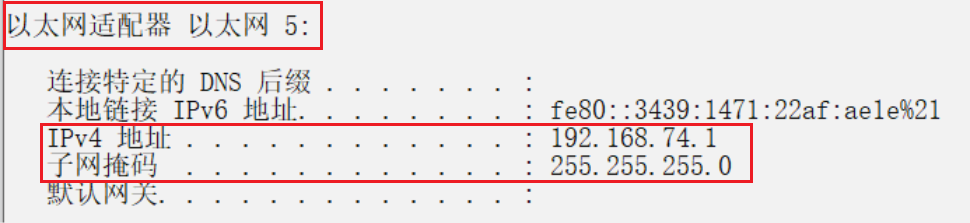 Microsoft Windows [版本 10.0.19045.3996] (c) Microsoft Corporation。保留所有权利。 C:\Users\dgq>ipconfig Windows IP 配置 无线局域网适配器 WLAN: 媒体状态 . . . . . . . . . . . . : 媒体已断开连接 连接特定的 DNS 后缀 . . . . . . . : 无线局域网适配器 本地连接* 2: 媒体状态 . . . . . . . . . . . . : 媒体已断开连接 连接特定的 DNS 后缀 . . . . . . . : 无线局域网适配器 本地连接* 9: 媒体状态 . . . . . . . . . . . . : 媒体已断开连接 连接特定的 DNS 后缀 . . . . . . . : 以太网适配器 以太网 5: 连接特定的 DNS 后缀 . . . . . . . : 本地链接 IPv6 地址. . . . . . . . : fe80::3439:1471:22af:ae1e%21 IPv4 地址 . . . . . . . . . . . . : 192.168.74.1 子网掩码 . . . . . . . . . . . . : 255.255.255.0 默认网关. . . . . . . . . . . . . : PPP 适配器 宽带连接: 连接特定的 DNS 后缀 . . . . . . . : IPv4 地址 . . . . . . . . . . . . : 10.10.0.148 子网掩码 . . . . . . . . . . . . : 255.255.255.255 默认网关. . . . . . . . . . . . . : 0.0.0.0 以太网适配器 以太网: 连接特定的 DNS 后缀 . . . . . . . : 本地链接 IPv6 地址. . . . . . . . : fe80::d98b:51de:d040:27dd%22 IPv4 地址 . . . . . . . . . . . . : 192.168.23.45 子网掩码 . . . . . . . . . . . . : 255.255.255.0 默认网关. . . . . . . . . . . . . : 192.168.23.1 以太网适配器 蓝牙网络连接: 媒体状态 . . . . . . . . . . . . : 媒体已断开连接 连接特定的 DNS 后缀 . . . . . . . : C:\Users\dgq>