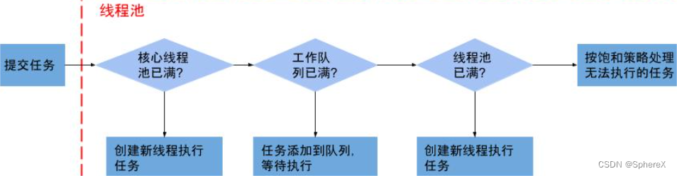 当任务来临时,它会先去判断一下实际线程数是否大于核心线程数,如果小于等于核心线程数,说明此时任务比较少,所以此时只需要创建一个新的线程来执行任务就完事了。