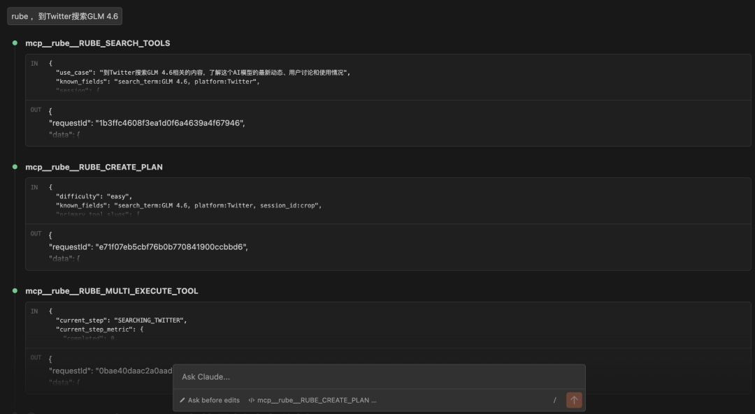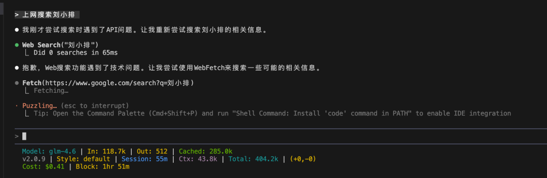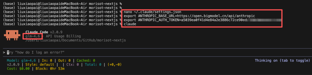 如果成功,会看到下面的图,明确显示已经使用了GLM-4.6