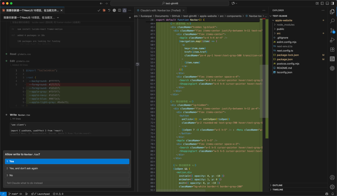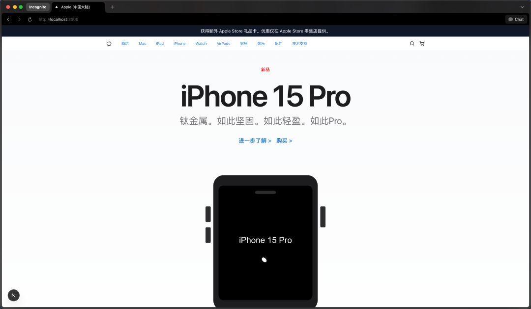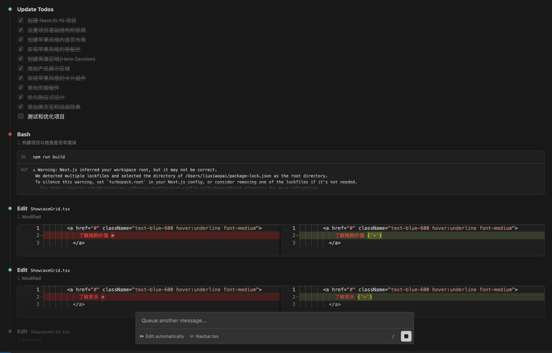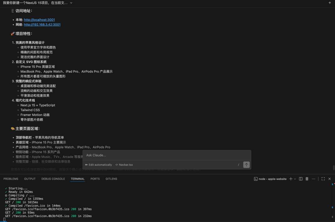 我没有给任何提示,让它一口气用NextJS完成一个苹果官网,