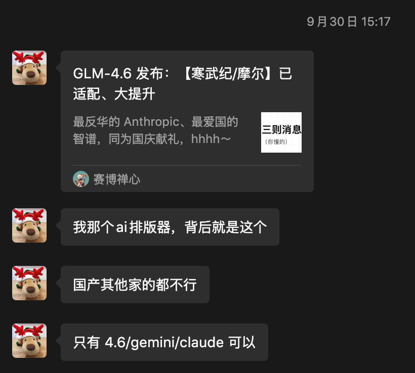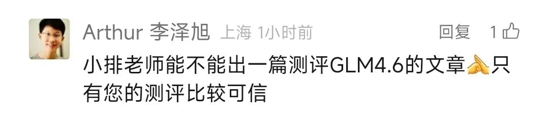 先是赛博禅心 @大聪明 老师私聊催我。他使用GLM 4.6实战完成了个实用排版工具,给予极高的评价。