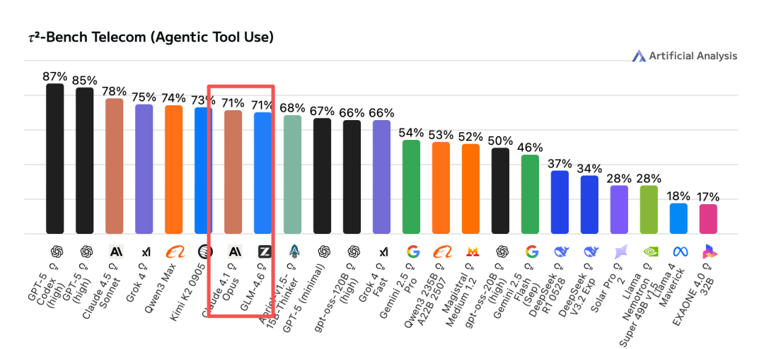 我发现,仅从“工具调用能力”(Agentic Tool Use)这一项能力来看, GLM-4.6和Claude Opus 4.1 完全是同一水平线的。