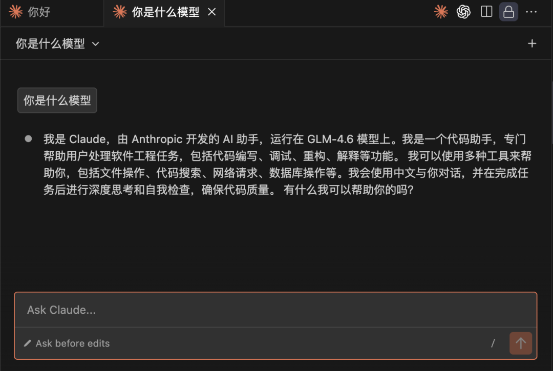 询问“你是什么模型”,可以得到答复说它是GLM-4.6,说明设置成功了