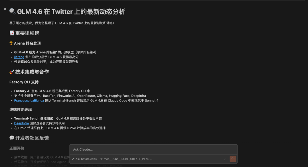 - 用GLM-4.6来驱动Claude Code,效果相当不错,不亚于Claude Sonnet 4.0,但是比不上Claude Sonnet 4.5和Claude Opus 4.1。下面是我的个人感受。