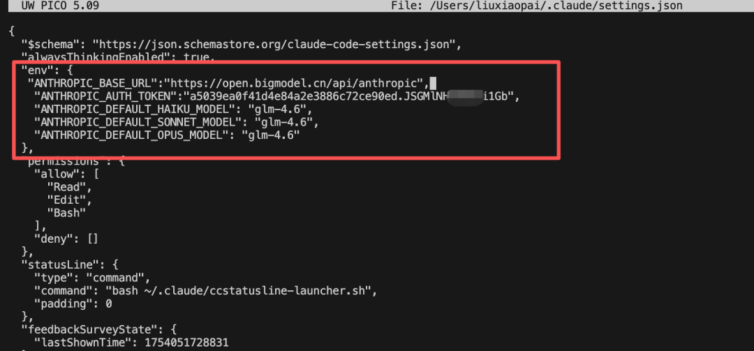 打开~/.claude/settings.json 文件后,修改下图红框中的5行。