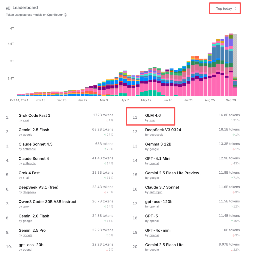 GLM-4.6 这次真的挺牛的,在世界范围内也大受欢迎。刚刚我发现了一条可能官网都还没发现的好消息 —— GLM-4.6 在OpenRouter的调用Trending榜(10月7日)拿到了1名、单日总榜第11名。这可是全世界开发者真金白银用钱投票出来的结果,无法刷票。 这个名次很不容易,排它前面的、主打编程的模型,并不多。