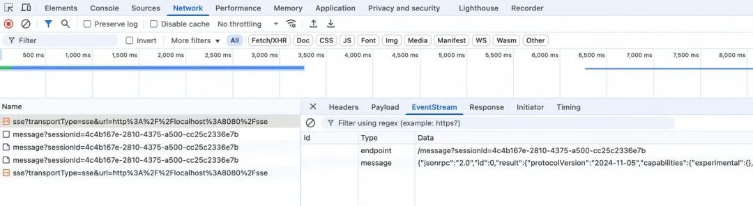 为了验证这个猜想,我还特地做一个实验,使用curl模拟了POST/messsage?sessionId=***发送一个请求包,果不其然在SSE的事件流中多了一条事件。