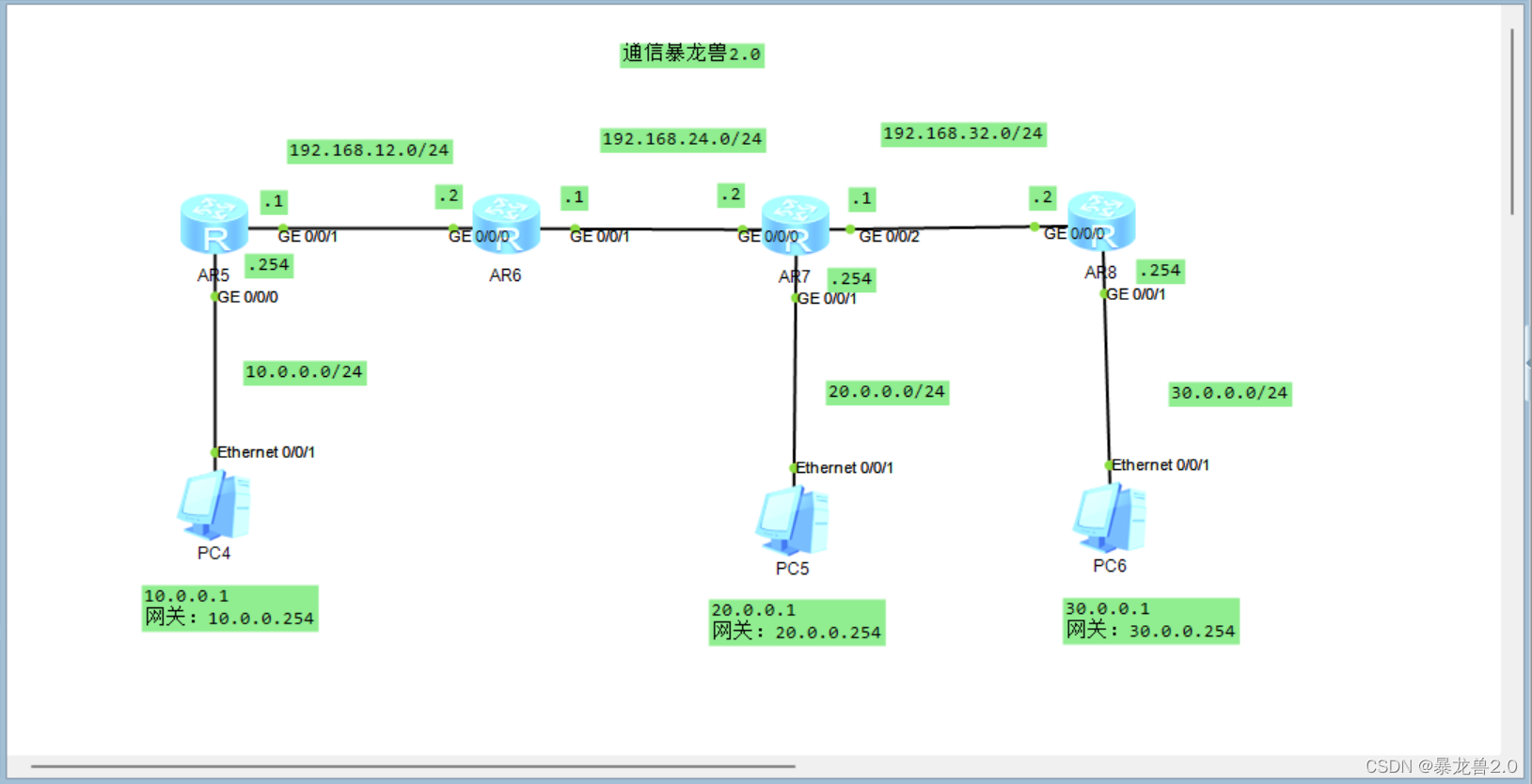 配置AR5到192.168.24.0;192.168.32.0;20.0.0.0;30.0.0.0网段静态路由,不需要配置到10.0.0.0网段的路由(因为他们是直连路由)AR6,AR7,AR8配置一样直连路由不需要配置