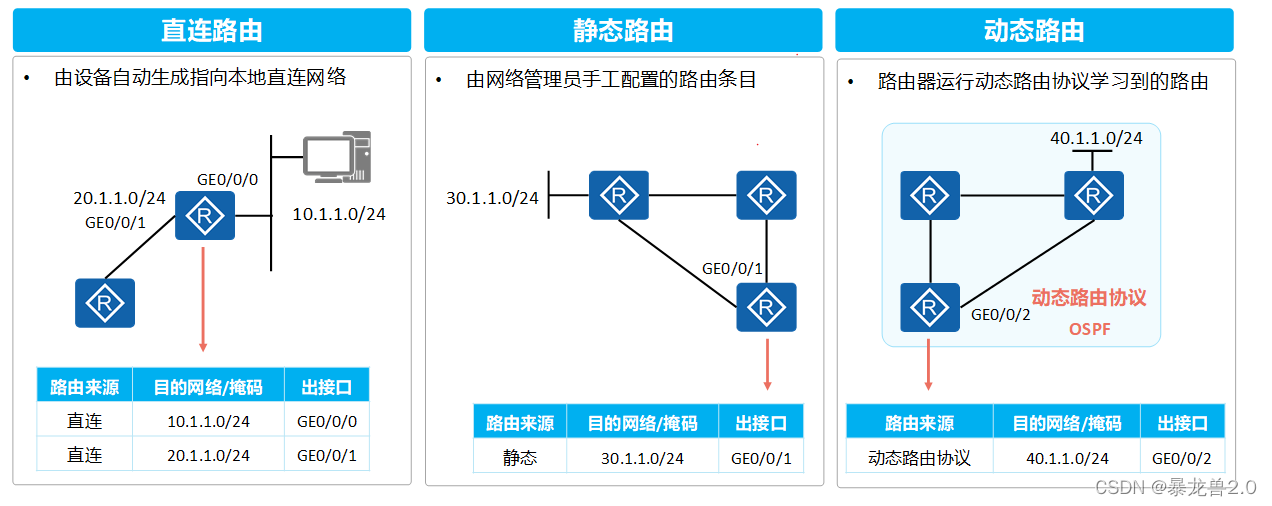 路由器依据路由表进行转发,要实现转发功能,路由器需要发现路由,三种常见的路由获取方式是:直连路由,静态路由,动态路由