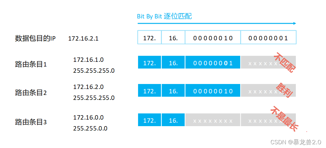 当路由器收到一个IP数据包时,会将数据包的目的IP地址与自己本地路由表中的所有路由表项进行逐位(Bit-By-Bit)比对,直到找到匹配度最长的条目,这就是最长前缀匹配机制。