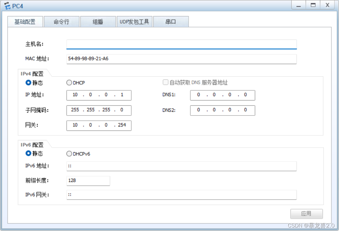 配置PC4,PC5,PC6的IP地址,子网掩码,网关以PC4为例(PC5,PC6根据拓扑图上的IP地址进行配置)