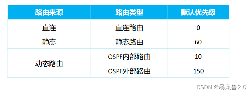 - 当路由器从不同路径获得到去往同一网段的路由(当这些路由的目的地址与掩码都相同)时,路由器会比较这些路由的优先级,优先选择优先级值最小的路由。