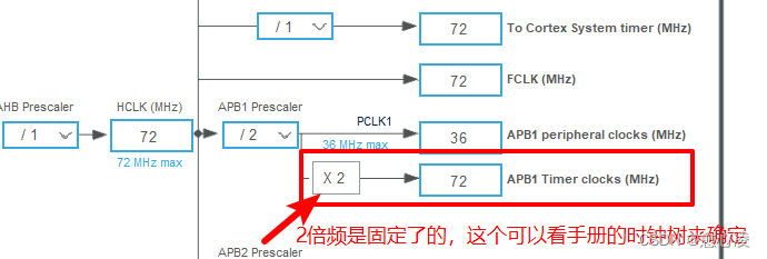 ——总线时钟分频——APB1总线分频是2分频。——因此总线时钟是36MHZ。——但是APB1的定时器时钟是72MHZ,时钟树到定时器的时钟有固定2倍频。