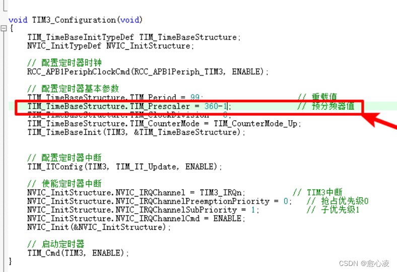 定时器的时钟频率是=(36*10^6)/(360-1+1)=100000HZ。