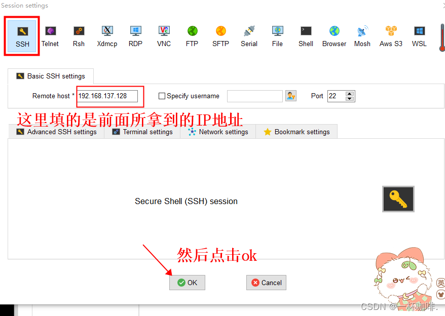 选择SSH,填入我们前面所拿到的IP地址,点击ok
