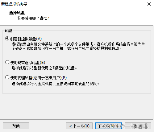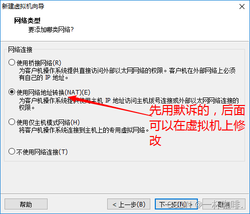 注:NAT网络地址转换,这种方式的会在宿主机创建一个虚拟NAT设备,虚拟机通过虚拟NAT设备使用宿主机的网络地址连接互联网。优点是连接互联网简单不用另外配置。