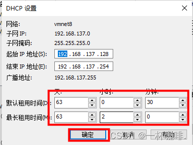 同时虚拟机安装结束之后要设置dhcp租用时间为63天,代表本虚拟机可以租用63天