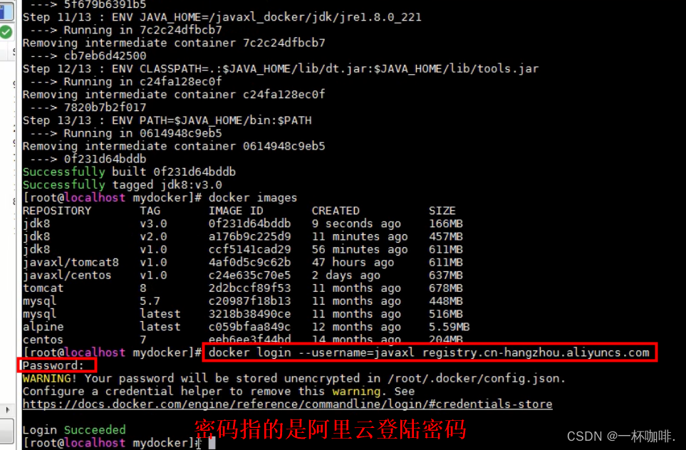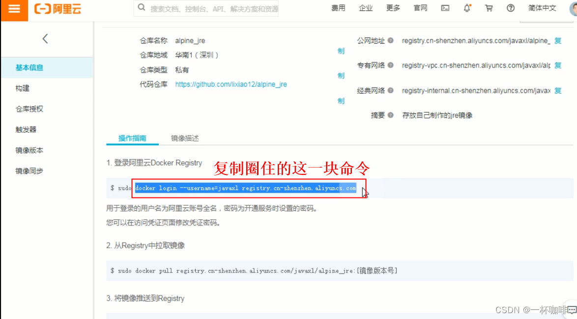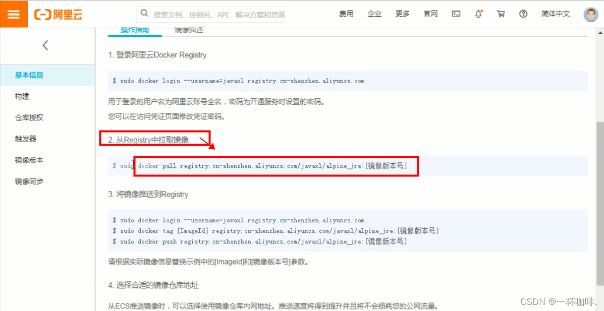 1.登录到阿里云的doker仓库,--username为阿里云的用户名,另外,密码为开通镜像