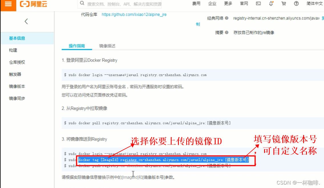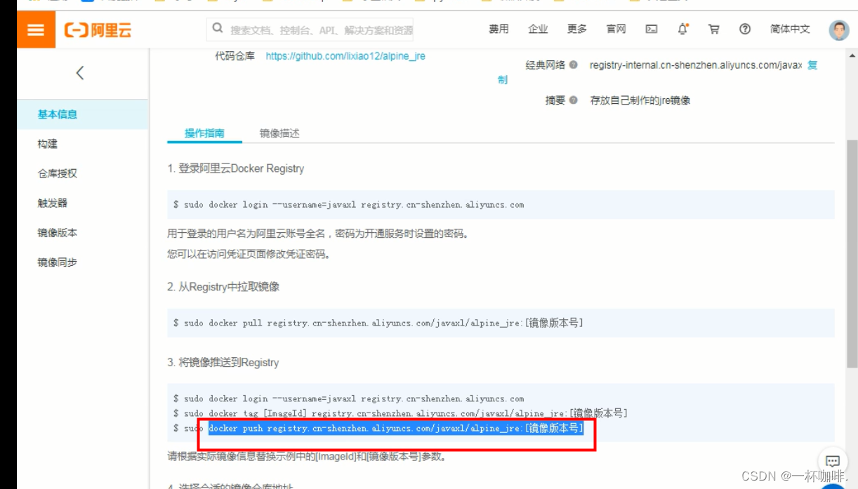 docker push registry.cn-shenzhen.aliyuncs.com/javaxl/alpine_jre:[镜像版本号]