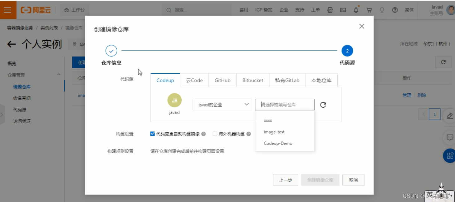 5.创建镜像仓库(创建镜像仓库时要绑定一个代码托管网站,例如:github)