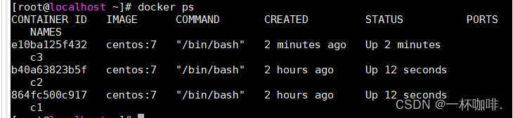 现在使用守护进程的方式启动容器,看看在c1中ping c2是否能够成功: