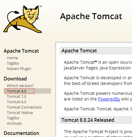 首先百度搜索Tomcat,到Apache的官网下载,这里选择的是最新版Tomcat8