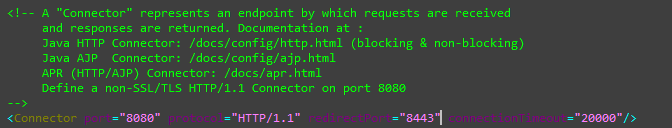 2. Tomcat的默认端口号为8080,可以在Tomcat目录中的conf目录下,打开server.xml,发现这么一行: