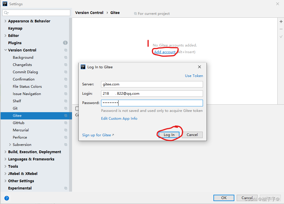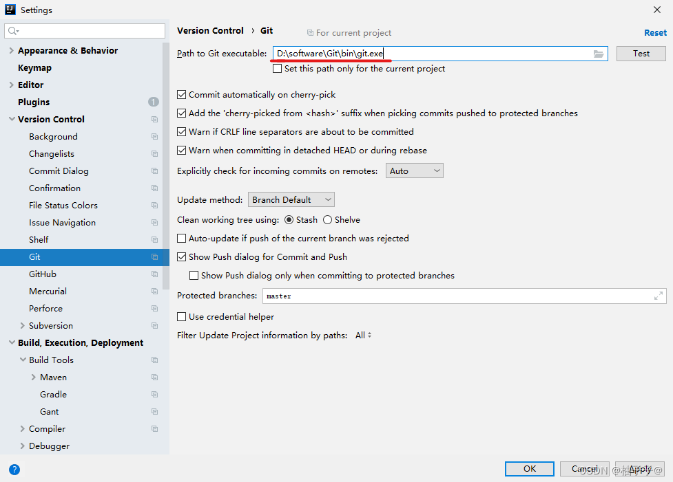 点击菜单“File->Settings->Version Control->Git”,设置Path to Git executable的值为:D:\software\Git\bin\git.exe